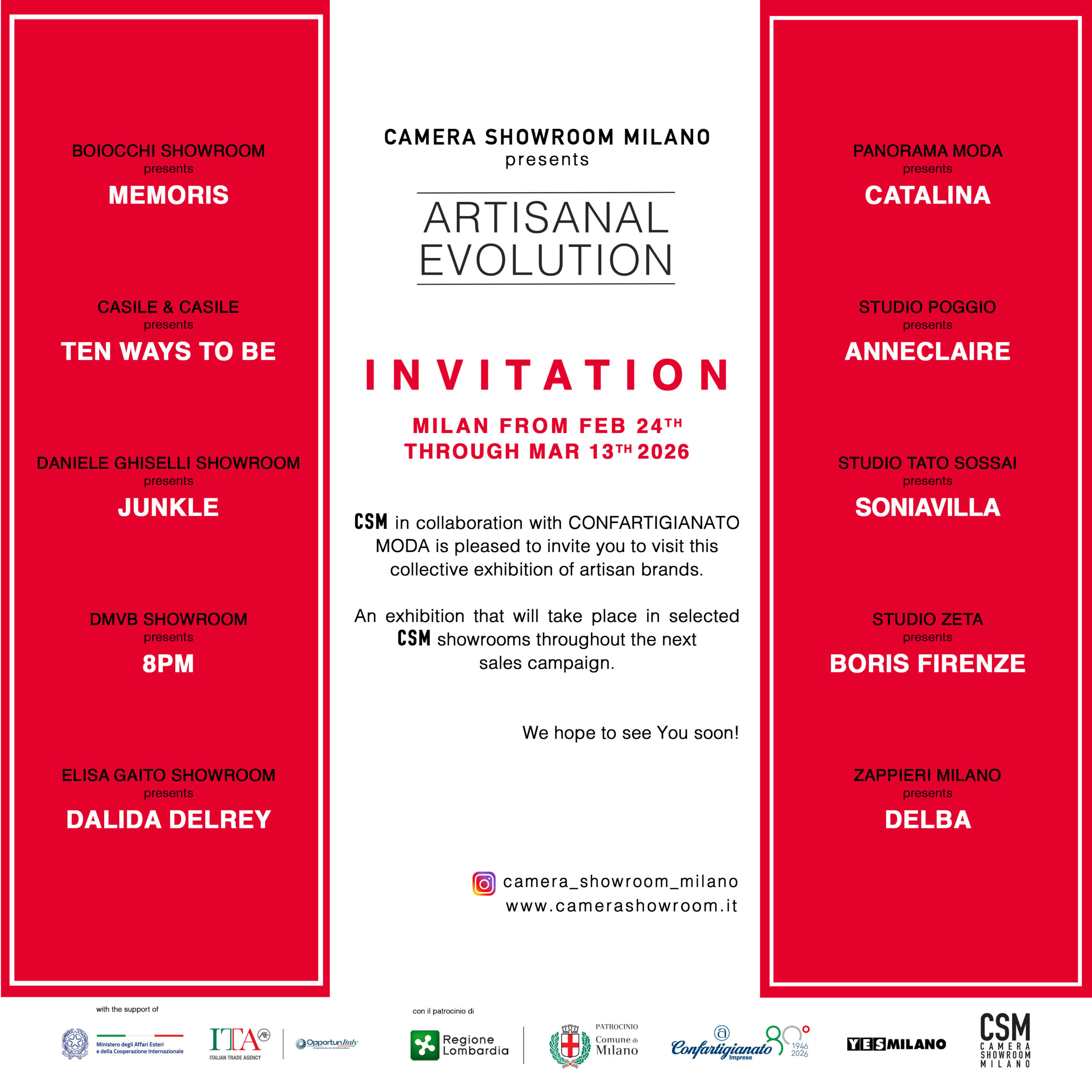 An exhibition event created to give visibility to the Italian SMEs of CONFARTIGIANATO, showcasing their collections in CSM showrooms during each Milan Fashion Week. The initiative offers companies growth opportunities through tutoring and visibility, promoting the “Made in Italy” excellence. The goal is to boost sales and access to both national and international markets, with a modular and uniform setup across all participating showrooms. Clothing collections are displayed on identical mannequins, while accessories are presented on cubes. The event is supported by Confartigianato Moda.