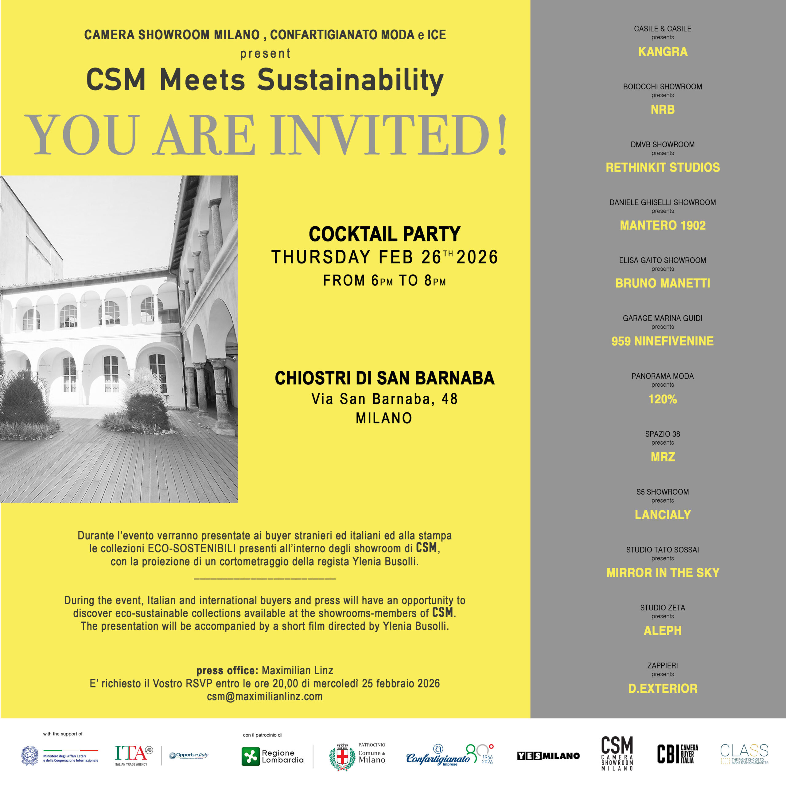 CSM MEETS SUSTAINABILITY is an event held during the four Milan Fashion Weeks, created to provide visibility and promotion to eco-sustainable brands featured in the showrooms of our members. The evening is dedicated to buyers, press, and fashion experts, with the aim of raising awareness throughout the textile and apparel industry about the importance of environmental protection, for a more livable and less polluted future. Eco-sustainable brands are promoted through a short film that, in addition to presenting the collections, spreads messages for a “greener” world. The event is supported by Confartigianato Moda.
